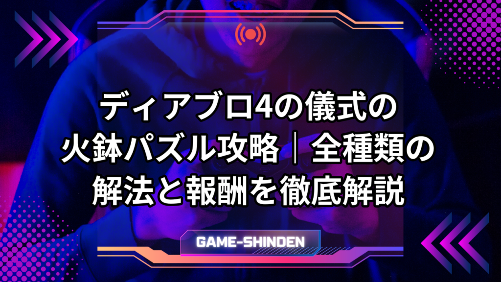 ディアブロ4をプレイしていると、地下室で突然現れる「儀式の火鉢」に戸惑った経験はないでしょうか。 通常の戦闘とは異なり、頭を使って解くパズル形式のギミックは、ハック&スラッシュに慣れたプレイヤーほど面食らいがちです。 さらに厄介なことに、出... -